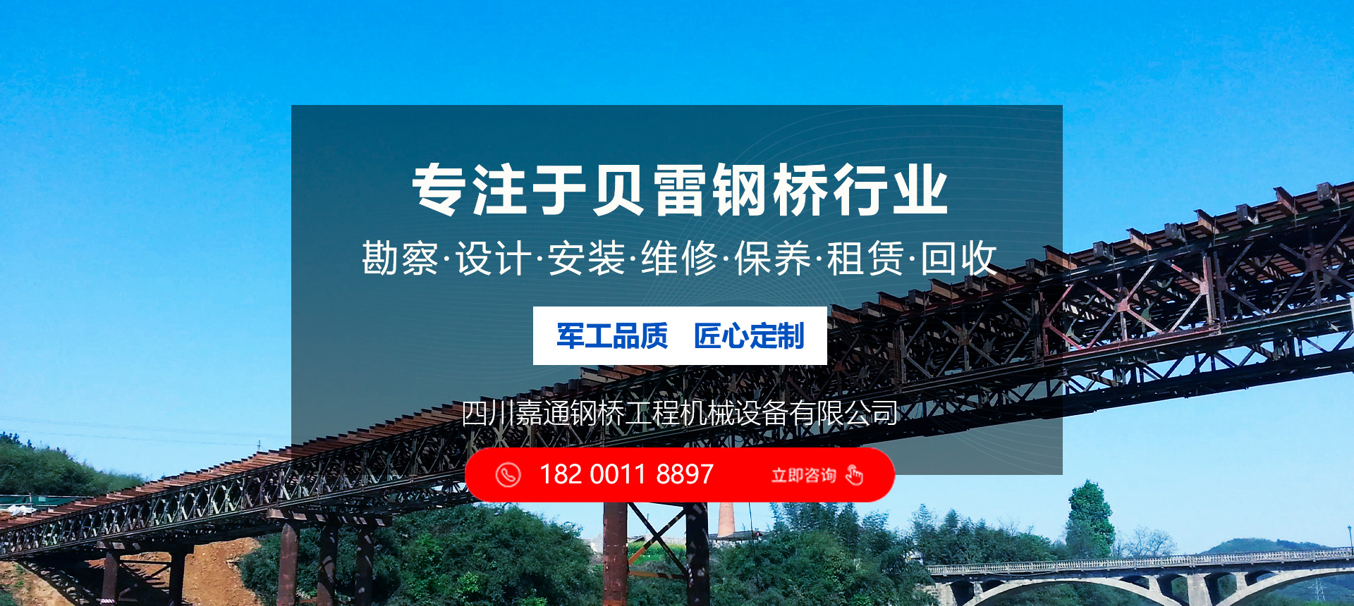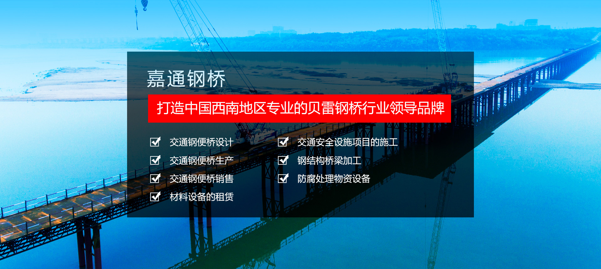 四川嘉通鋼橋工程機(jī)械設(shè)備有限公司坐落于有著天府之國(guó)的成都。以成都為中心,西南.西北和華中市場(chǎng)同步發(fā)展,打造中國(guó)西南地區(qū)專業(yè)的貝雷鋼橋行業(yè)領(lǐng)導(dǎo)品牌。, 主要從事: 交通鋼便橋的設(shè)計(jì)以及生產(chǎn)銷(xiāo)售 材料設(shè)備的租賃 交通安全設(shè)施項(xiàng)目的施工 鋼結(jié)構(gòu)橋梁加工及防腐處理物資設(shè)備等業(yè)務(wù)。   公司堅(jiān)持 “承諾必須兌現(xiàn)、要約必須履行”的誠(chéng)信態(tài)度, “質(zhì)量第一、客戶至上”的經(jīng)營(yíng)理念, 把領(lǐng)先的技術(shù)、卓越的管理和完全以客戶為中心的服務(wù)融為一體,為您提供優(yōu)質(zhì)的產(chǎn)品和完善的服務(wù)。